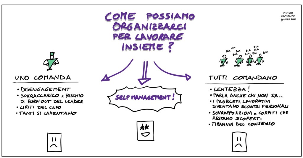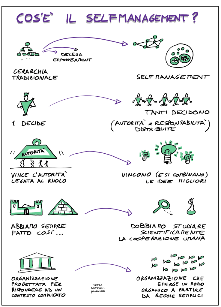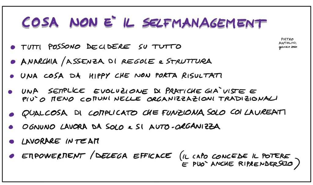 Racchiude in sè tanti aspetti, primo fra tutti il fatto che questa strada non è istintiva e naturale ma va coltivata. Tutti noi abbiamo esperienza di gerachie più o meno top-down (famiglia, istruzione, lavoro) e tendiamo a metterci in una posizione di superiorità o inferiorità. Percorrere la strada del self-management vuol dire impegnarsi ogni giorno per uscire da questi schemi.
